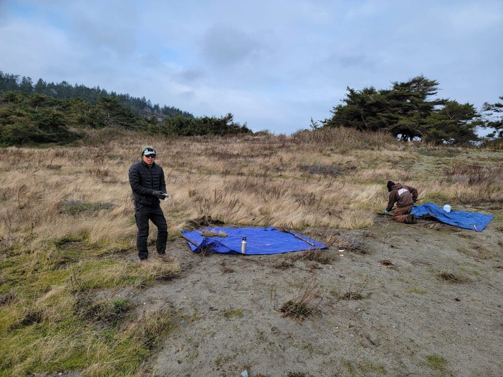 A large area of supportive habitat near the Fort Worden Lighthouse is impacted by non-native grasses and sedums, including European beachgrass (Ammophila arenaria) and a garden variety of sedum (Sedum acre). There are also clumping grasses facilitating the growth of mosses and liverworts that don’t normally grow on sand dunes and are reducing the natural habitat of yellow-sand verbena.